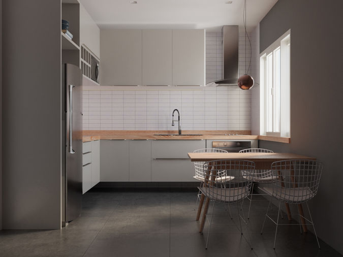 Esta cozinha é projetada para o uso cotiadino com espaços planejados para os eletrodomésticos, bastante espaço de armazenamento, uma bancada de apoio, além de uma mesa de refeições que comporta quatro pessoas.